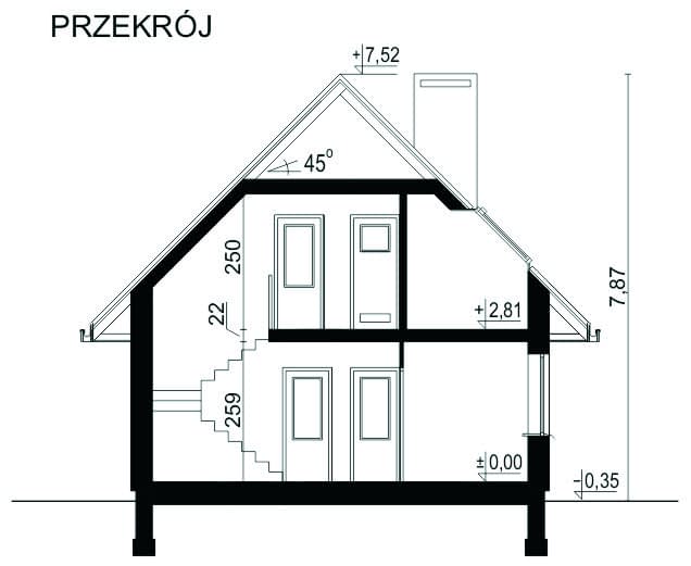 Ściany zewnętrzne: gr. 39 cm z POROTHERM 25cm + 14cm styropian; strop: żelbetowy; schody: drewniane; dach: dwuspadowy o nachyleniu 45 stopni, więźba krokwiowo - jętkowa z płatwią kalenicową, krycie dachówką ceramicznąRzuty