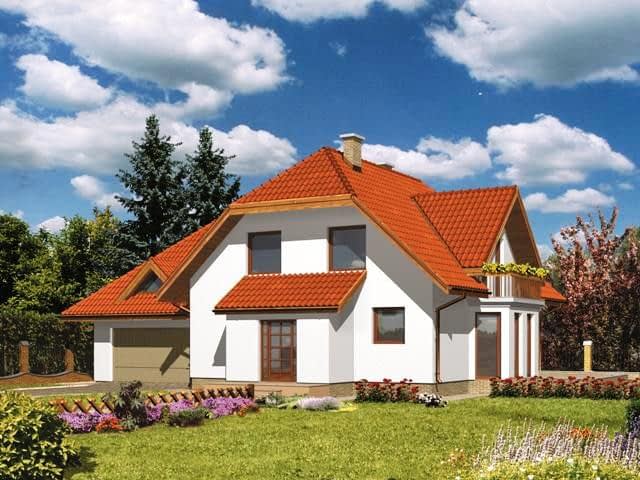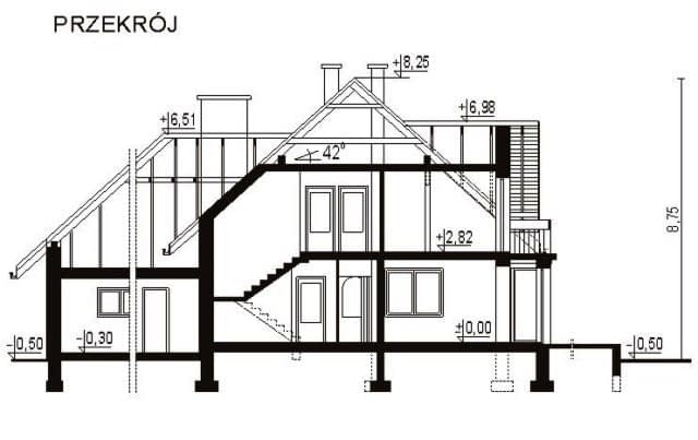 Ściany zewnętrzne: gr. 44 cm z pustaków ceramicznych POROTHERM; strop: żelbetowy; schody: żelbetowe; dach: dwuspadowy z naczółkami, nad garażem trójspadowy o nachyleniu 42 stopni, więźba krokwiowo-płatwiowo-kleszczowa, krycie dachówkąRzuty