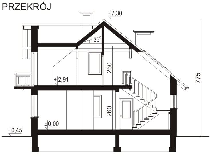 Ściany zewnętrzne: gr. 41 cm z pustaków ceramicznych + styropian; strop: TERIVA, nad garażem - żelbetowy; schody: drewniane; dach: dwuspadowy o nachyleniu 39 stopni, więźba krokwiowo-płatwiowo-jętkowa, krycie dachówkąRzuty