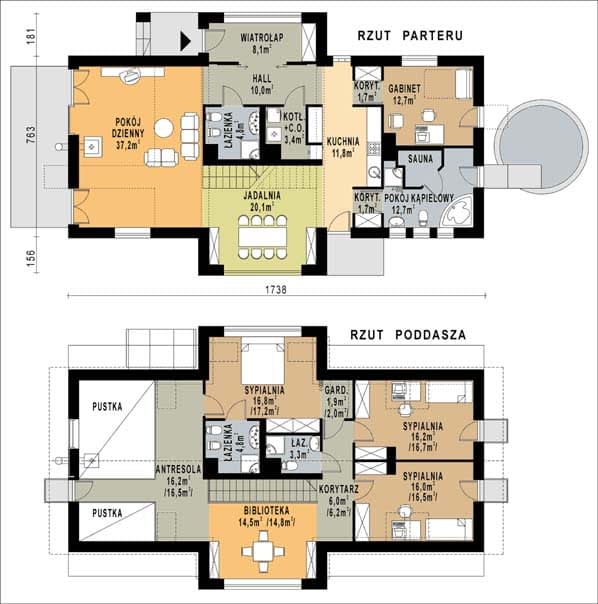 Ściany zewnętrzne: gr. 44 cm z pustaków ceramicznych POROTHERM; strop: POROTHERM; schody: żelbetowe; dach: wielospadowy o nachyleniu 30 stopni, więźba krokwiowo-jetkowa, krycie blachodachówkąRzuty