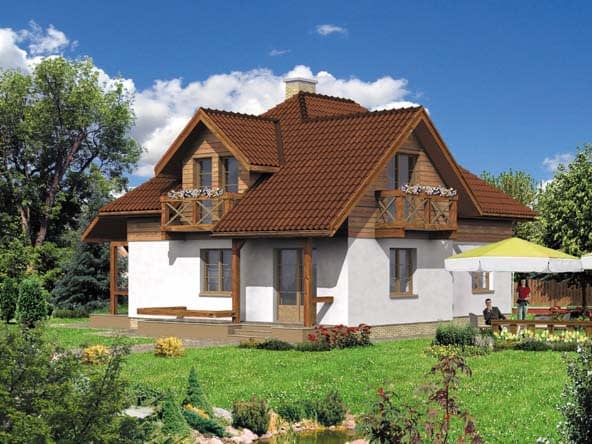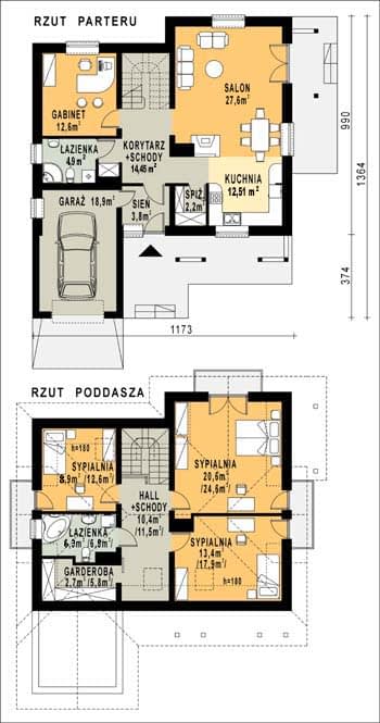 Ściany zewnętrzne: gr. 44 cm z pustaków ceramicznych POROTHERM; strop: POROTHERM; schody: żelbetowe; dach: dwuspadowy o nachyleniu 40 stopni, więźba krokwiowo-płatwiowo-jętkowa, krycie dachówkąRzuty