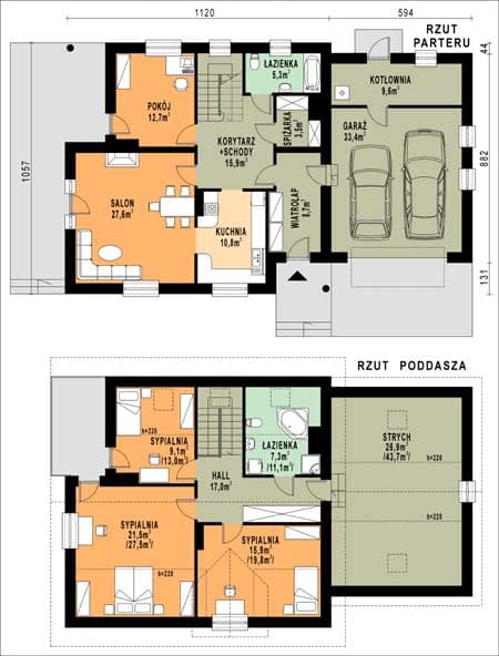 Ściany zewnętrzne: gr. 44 cm z pustaków ceramicznych POROTHERM; strop: POROTHERM; schody: żelbetowe; dach: dwuspadowy o nachyleniu 41 stopni, więźba krokwiowo-płatwiowo-jętkowaRzuty