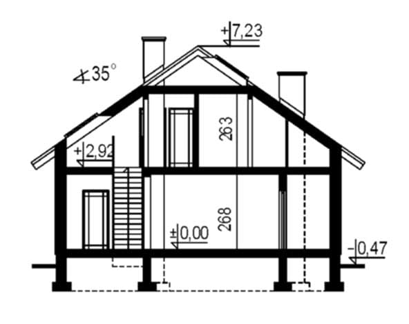 Ściany zewnętrzne: gr. 38 cm z pustaków ceramicznych POROTHERM; strop: żelbetowy; schody: drewniane; dach: czterospadowy, o nachyleniu 35 stopniRzuty