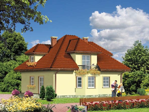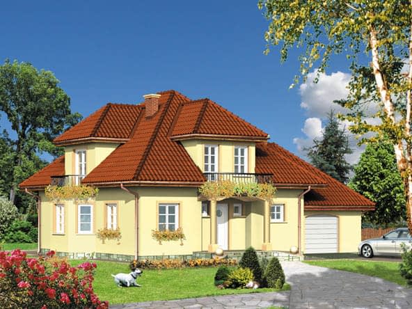 Ściany zewnętrzne: gr. 41 cm z pustaków ceramicznych MAX + styropian; strop: żelbetowy; schody: żelbetowe; dach: wielospadowy o nachyleniu 41 stopniRzuty