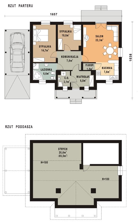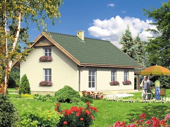 Ściany zewnętrzne: gr. 39 cm z pustaków ceramicznych + wełna ROCKWOOL; strop: żelbetowy; schody: drewniane; dach: dwuspadowy o nachyleniu 35 stopni, krycie dachówkąRzuty