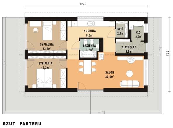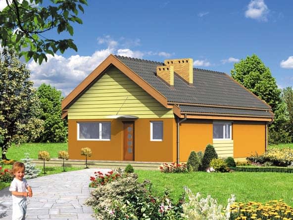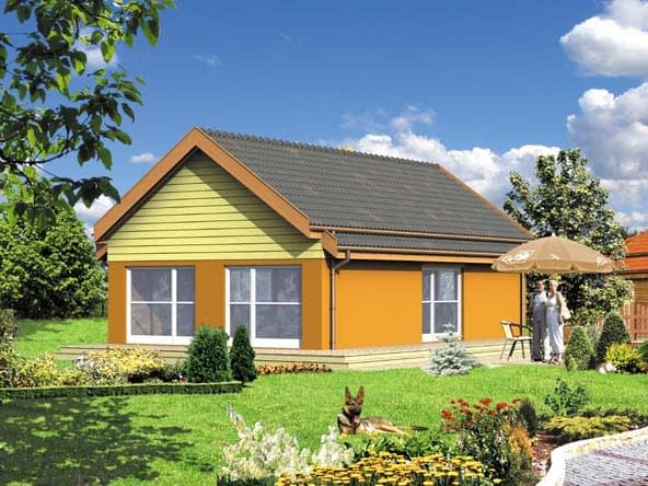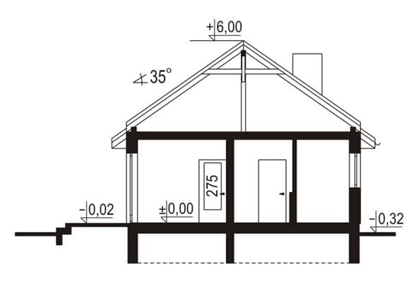 Ściany zewnętrzne: gr. 36 cm z betonu komórkowego + wełna mineralna; strop: drewniany; dach: dwuspadowy o nachyleniu 35 stopni, krycie blachodachówkąRzuty