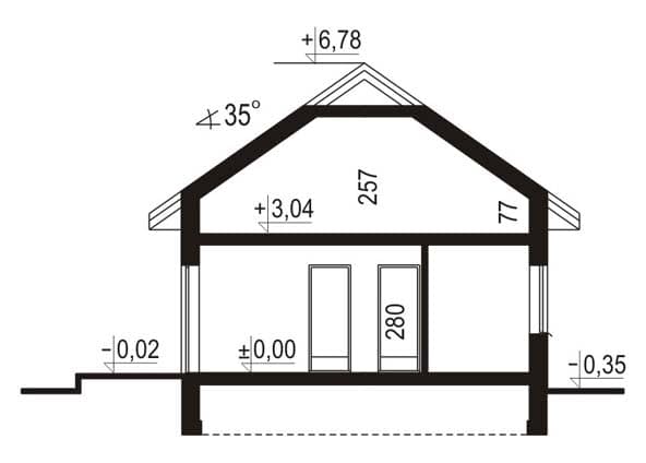 Ściany zewnętrzne: gr. 39 cm z pustaków ceramicznych+ styropian; strop: żelbetowy; schody: drewniane; dach: dwuspadowy o nachyleniu 35 stopni, krycie dachówkąRzuty