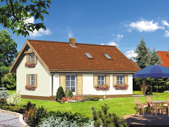 Ściany zewnętrzne: gr. 39 cm z pustaków ceramicznych + wełna ROCKWOOL; strop: żelbetowy; schody: drewniane; dach: dwuspadowy o nachyleniu 35 stopni, krycie dachówkąRzuty