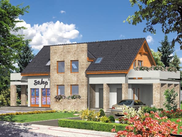 Budynek jednorodzinny parterowy z poddaszem mieszkalnym i sklepem, niepodpiwniczony.Konstrukcja