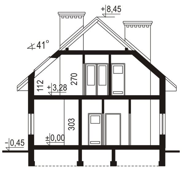 Ściany zewnętrzne: gr.36,5cm; bloczki YTONG EnergoUltra+PP2,2/,03; strop: żelbetowy; schody: żelbetowe; dach: dwuspadowy o nachyleniu 41 stopni, kryty dachówkąRzuty