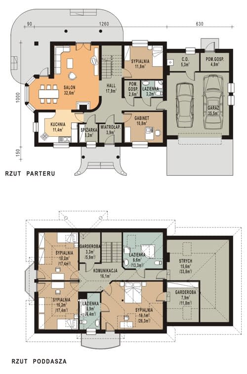 Ściany zewnętrzne: gr. 36,5 cm z bloczków YTONG; strop: żelbetowy; dach: czterospadowy o nachyleniu 38 stopni, krycie dachówkąRzuty