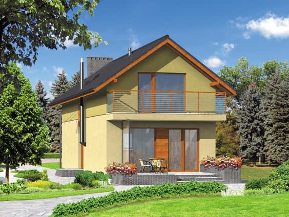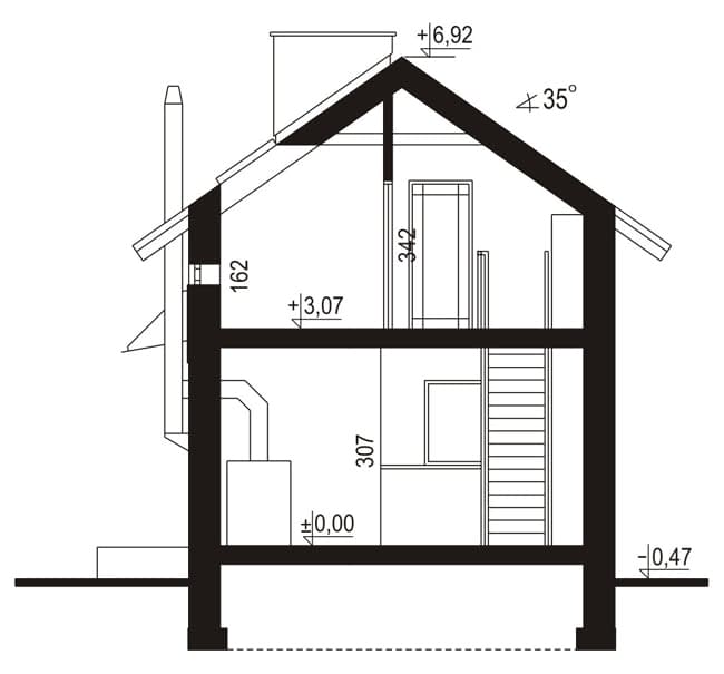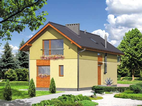 Ściany zewnętrzne: gr. 44 cm z pustaków ceramicznych POROTHERM; strop: żelbetowy; schody: drewniane; dach: dwuspadowy o nachyleniu 35 stopni, kryty dachówką ceramiczną KORAMICRzuty