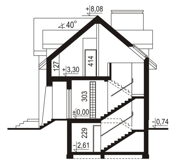 Ściany zewnętrzne: gr. 36,5 cm z bloczków YTONG; strop: żelbetowy; schody: żelbetowe; dach: dwuspadowy o kącie nachylenia 40 stopni, kryty blachą dachówkopodobnąRzuty