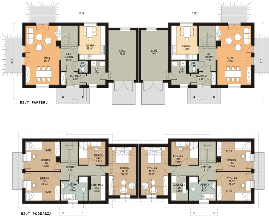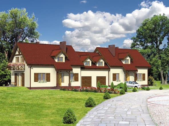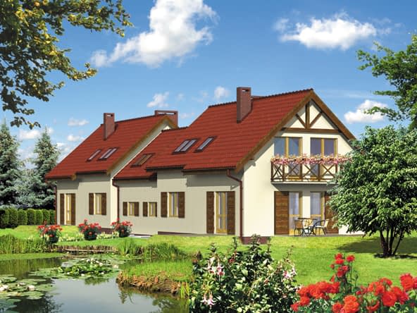 Budynek dwurodzinny, bliźniak, parterowy z poddaszem mieszkalnym, niepodpiwniczony. Dane dla jednego segmentuKonstrukcja