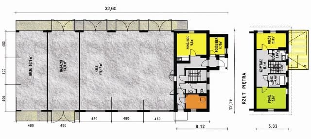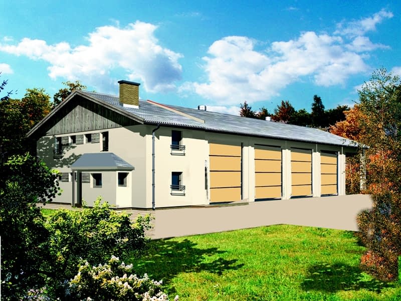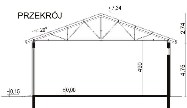 Budynek gospodarczy z halą, magazynem i wiatą. Zaprojektowano zaplecze i mieszkanie służbowe. obiekt wolnostojący, jednokondygnacyjny. Segment zaplecza i mieszkania służbowego jest budynkiem piętrowym. Budynek można skracać lub wydłużać zmieniając ilość segmentów. Długość segmentu budynku 4,8 m. Budynek można wykorzystać po adaptacji na serwis samochodowy, magazyn towarów nie wymagający ogrzewania. Może być również wykorzystany na warsztaty produkcyjne lub hangar na łodzie żagloweKonstrukcja
