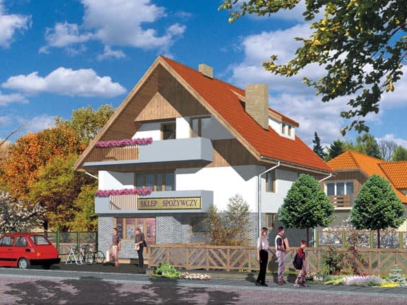 Budynek jednorodzinny piętrowy (niskim i wysokim parter) poddasze mieszkalne, niepodpiwniczony z funkcją usługową, sklep.Konstrukcja