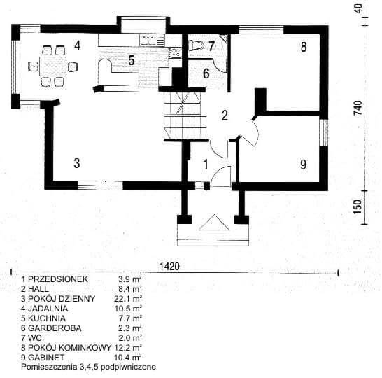 Budynek jednorodzinny dwupoziomowy częściowo podpiwniczony. 5 pokoi z kuchnią. W poziomie piwnic garaż i pomieszczenie techniczno -gospodarczeKonstrukcja