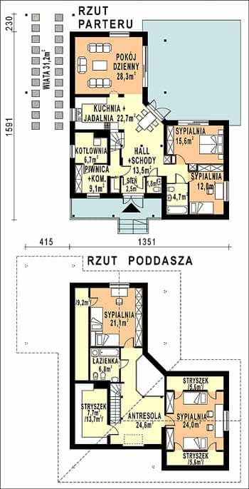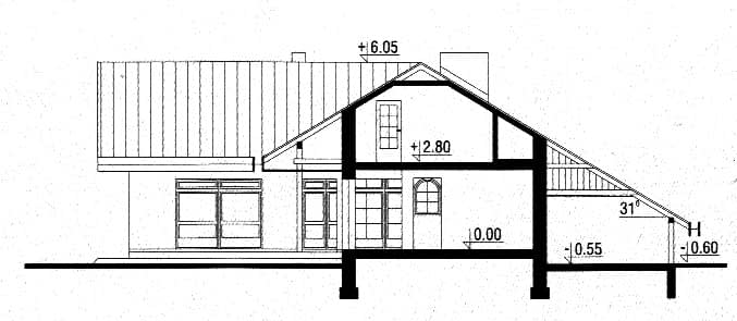 Ściany zewnętrzne: gr. 43,0 cm, pustak ceramiczny POROTHERM + styropian; strop: żelbetowy; schody: żelbetowe; dach: dwuspadowy o nachyleniu 31 stopni, więźba drewniana, krycie dachówkąRzuty