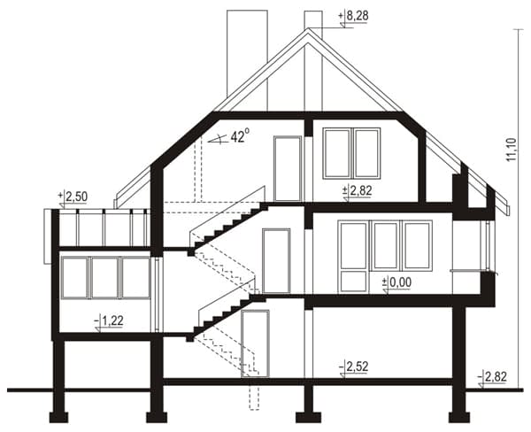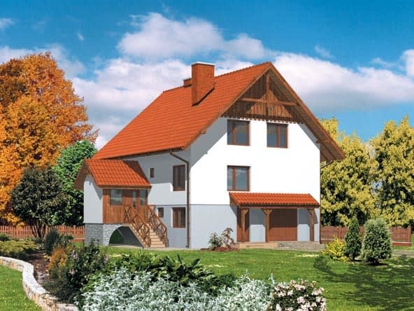 Ściany zewnętrzne: gr. 38 cm z pustaków ceramicznych + styropian; strop: FERT; schody: żelbetowe; dach: dwuspadowy, o nachyleniu 42 stopni, więźba krokwiowo-jętkowa, krycie dachówką lub blachą głębokotłoczonąRzuty