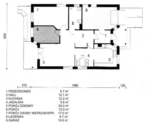 Budynek mieszkalny dla osoby niepełnosprawnej parterowy, niepodpiwniczony. Program - 3 pokoje z kuchnią + garaż.Konstrukcja