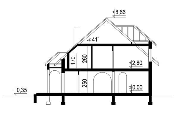 Ściany zewnętrzne: grubość 38,0 cm - pustak ceramiczny + wełna mineralna; strop: FERT; schody: żelbetowe; dach: dwuspadowy o nachyleniu 41 stopni, więźba krokwiowo-jętkowa, krycie dachówką cementową BRAASRzuty