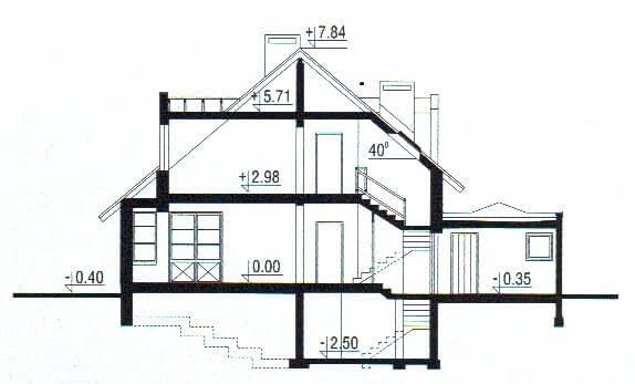 Ściany zewnętrzne: gr. 38 cm z pustaków ceramicznych + styropian; strop: Fert 40, nad poddaszem drewniany. Nad garażem stropodach na płycie żelbetowej monolitycznej; schody: żelbetowe; dach: dwuspadowy o kacie nachylenia 40 stopni, kryty dachówką bitumiczną lub blachą dachówkowąRzuty