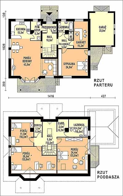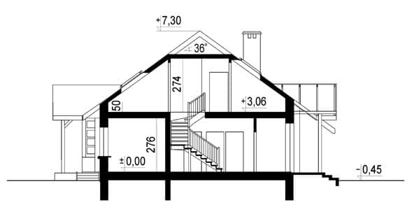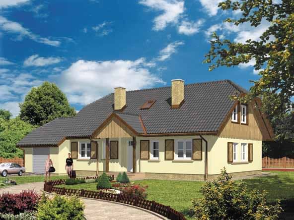 Ściany zewnętrzne: gr. 43,0 cm z pustakow ceramicznych + styropian; strop: FERT; schody: drewniane; dach: dwuspadowy o nachyleniu 36 stopni, więźba krokwiowo-jętkowa, krycie dachówką cementową lub ceramicznąRzuty