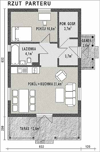 Ściany zewnętrzne: grubość 26 cm, szkielet drewniany ocieplony wełną mineralną; strop: drewniany; dach: dwuspadowy o nachyleniu 36 stopni, więźba krokwiowo-jętkowa, krycie blachą dachówkowąRzuty