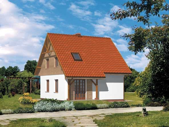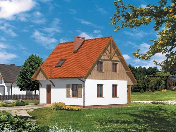 Ściany zewnętrzne: grubość 36,5 cm z bloczków YTONG EnergoUltra+PP2,2/0,3; strop: drewniany; schody: drewniane; dach: dwuspadowy o nachyleniu 45 stopni, więźba krokwiowo-jętkowa, krycie blachą dachówkowąRzuty