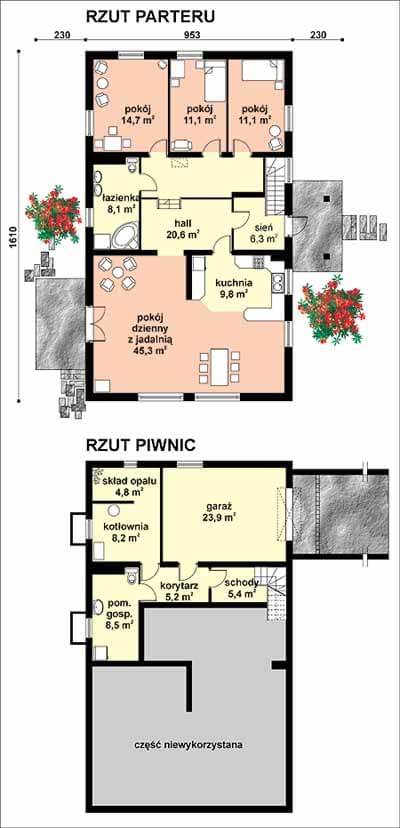 Budynek jednorodzinny, parterowy, z garażem, częściowo podpiwniczonyKonstrukcja