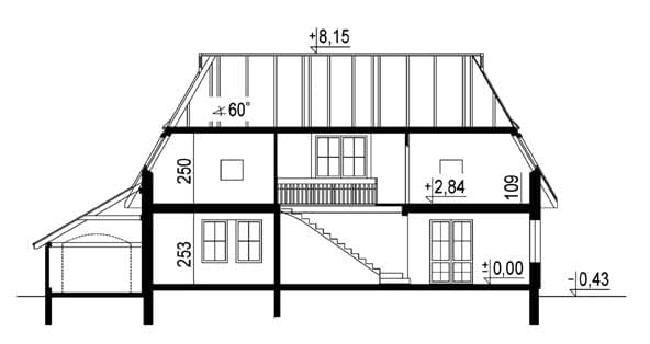 Ściany zewnętrzne: grubość 36,5 cm z bloczków YTONG; strop: TERIVA; schody: drewniane; dach: czterospadowy o nachyleniu 45 i 60 stopni, więźba krokwiowo-jętkowa, krycie dachówką ceramiczną lub blachą płaską powlekanąRzuty