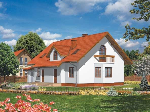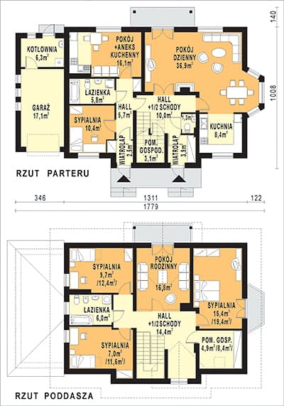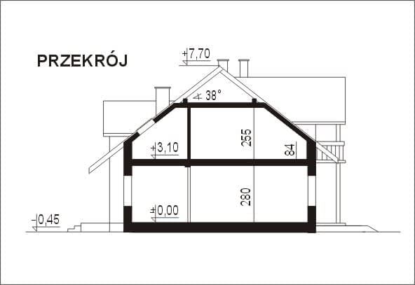 Ściany zewnętrzne: gr. 38 cm z pustaków ceramicznych POROTHERM; strop: FERT; schody: żelbetowe; dach: dwuspadowy o nachyleniu 38 stopni, więźba krokwiowo-jętkowa, krycie dachówkąRzuty