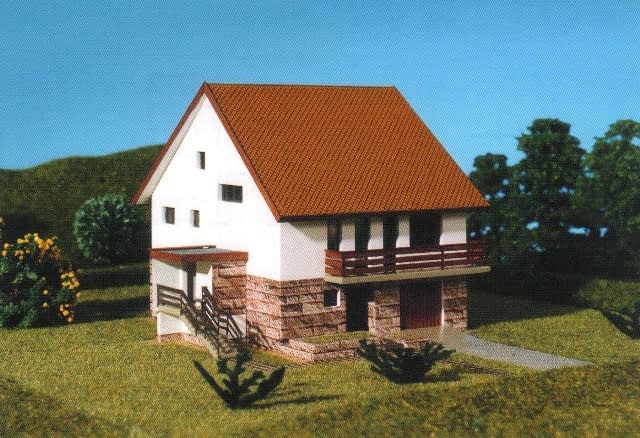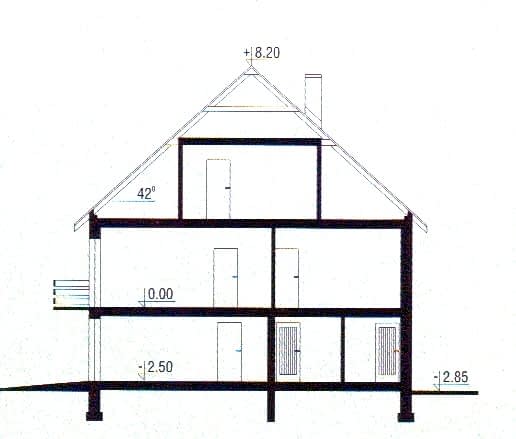 Budynek jednorodzinny parterowy z poddaszem mieszkalnym. Program - 4 pokoje z kuchnią. W przyziemiu garaż i pomieszczenia techniczno-gospodarcze z oddzielnym wejściem.Konstrukcja