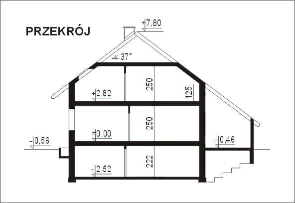 Ściany zewnętrzne: gr. 40 cm z pustaków ceramicznych + styropian; strop: FERT-40; schody: żelbetowe, dwubiegowe; dach: dwuspadowy o nachyleniu 37 stopni, więźba krokwiowo-jętkowa, krycie dachówką ceramicznąRzuty