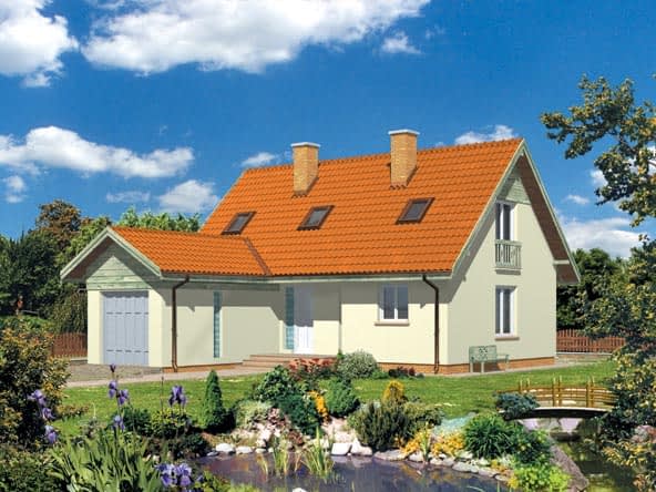 Ściany zewnętrzne: gr. 36,5 cm z bloczków YTONG; strop: FERT; schody: drewniane; dach: dwuspadowy o nachyleniu 45 stopni i 30 stopni /nad garażem/, więźba krokwiowo-jętkowa z płatwią kalenicową, krycie dachówkąRzuty