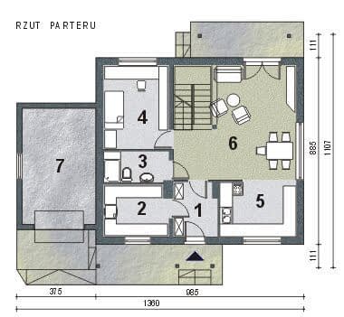 Ściany zewnętrzne: grubość 36,5 cm z bloczków YTONG; strop: TERIVA 1, płyta żelbetowa gr. 10 cm; schody: żelbetowe płytowe, dwubiegowe; dach: dwuspadowy o nachyleniu 42 stopni, więźba drewniana, krycie dachówką ceramiczną BRAASRzuty
