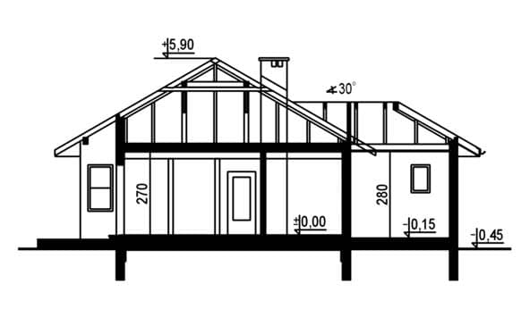 Ściany zewnętrzne: grubość 26 cm, szkielet drewniany, ocieplenie wełną mineralną GULLFIBER 15 cm; strop: drewniany belkowy (nieużytkowy); dach: czterospadowy o nachyleniu 30 stopni, więźba drewniana, krycie dachówką ceramiczną lub cementowąRzuty