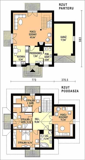 Ściany zewnętrzne: gr. 36,5 cm z bloczków YTONG; strop: TERIVA; schody: drewniane; dach: dwuspadowy o nachyleniu 45 stopni, więźba krokwiowo-jętkowa, krycie dachówką ceramicznąRzuty