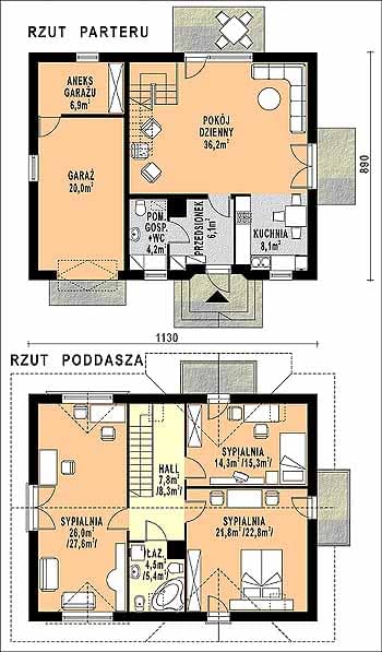 Ściany zewnętrzne: gr. 36,5 cm z bloczków YTONG; strop: TERIVA; schody: drewniane; dach: dwuspadowy o nachyleniu 45 stopni, więźba krokwiowo-jetkowa, krycie dachówkąRzuty