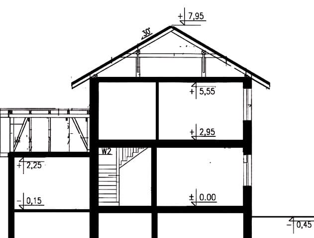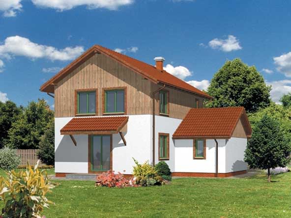 Ściany zewnętrzne: gr. 36,5 cm z bloczków YTONG; strop: FERT; schody: drewniane; dach: dwuspadowy o nachyleniu 30 stopni, więźba krokwiowo-jętkowa, krycie dachówkąRzuty