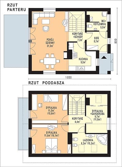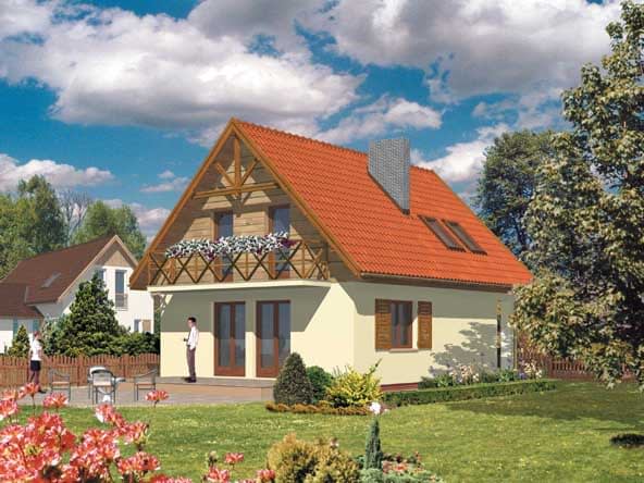 Ściany zewnętrzne: gr. 39 cm z pustaków ceramicznych + wełna Rockwool; strop: żelbetowy; schody: żelbetowe; dach: dwuspadowy o nachyleniu 45 stopni, więźba krokwiowo-jętkowa, krycie dachówkąRzuty