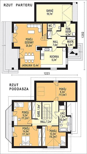 Ściany zewnętrzne: gr. 38 cm z pustaków ceramicznych POROTHERM; strop: TERIVA; dach: wielospadowy o nachyleniu 42 stopni, krycie dachówkąRzuty