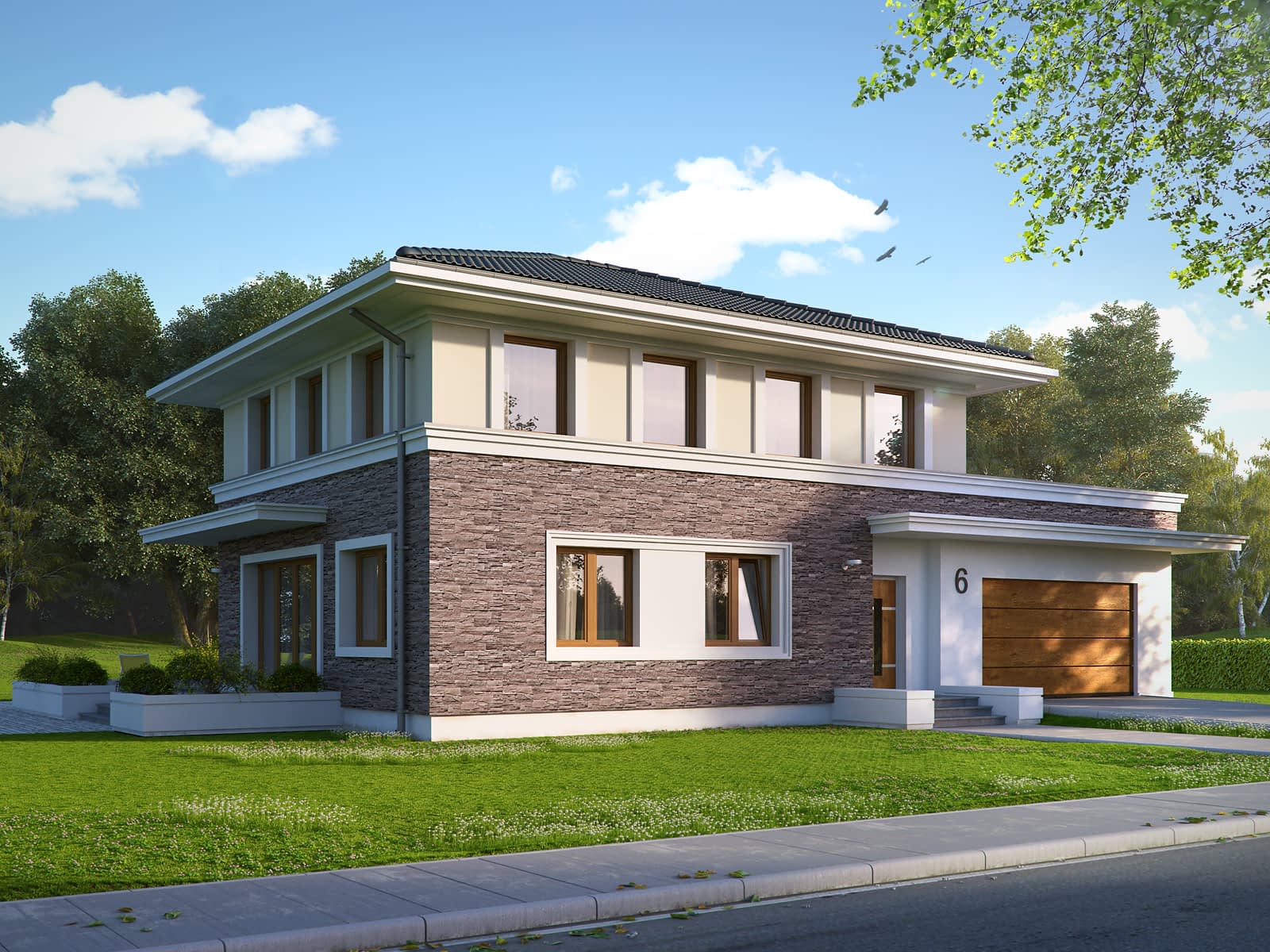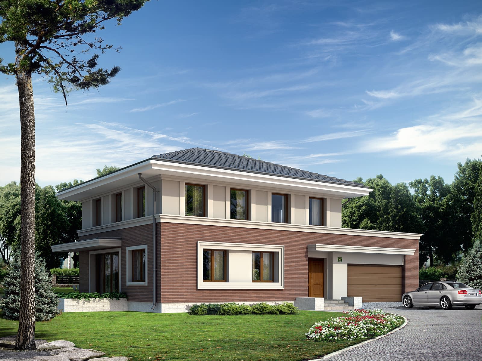 Dom jednorodzinny, dwukondygnacyjny z garażem dwustanowiskowym, niepodpiwniczony. Dzięki dwóm pełnym kondygnacjom istnieje możliwość łatwej aranżacji pomieszczeń. Na piętrze znajdują się trzy sypialnie i łazienka.Konstrukcja