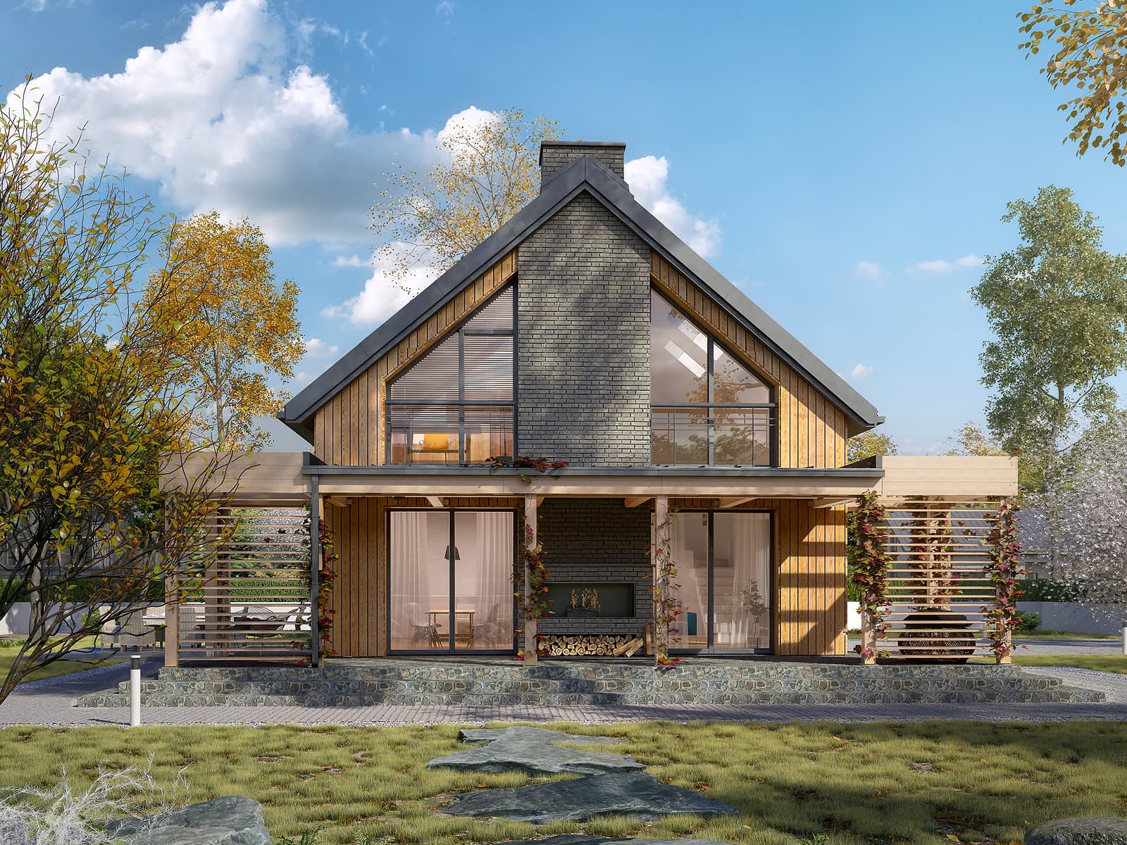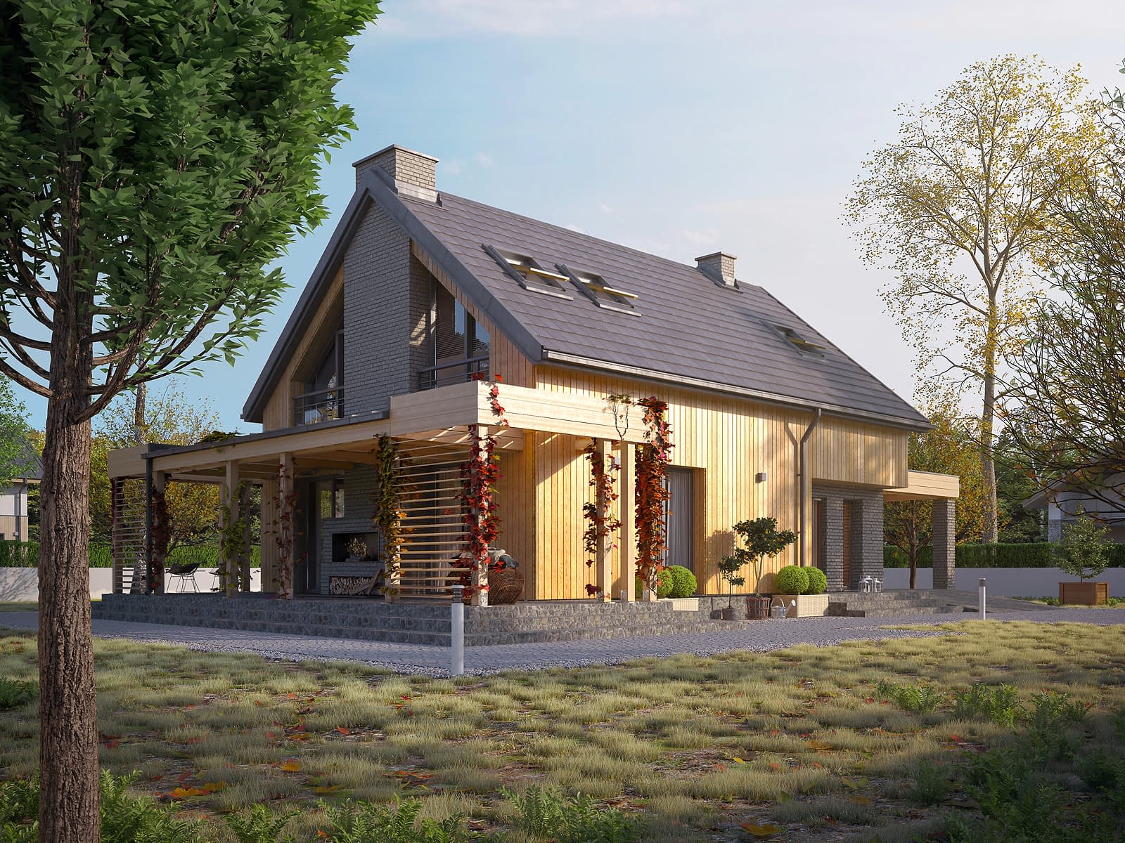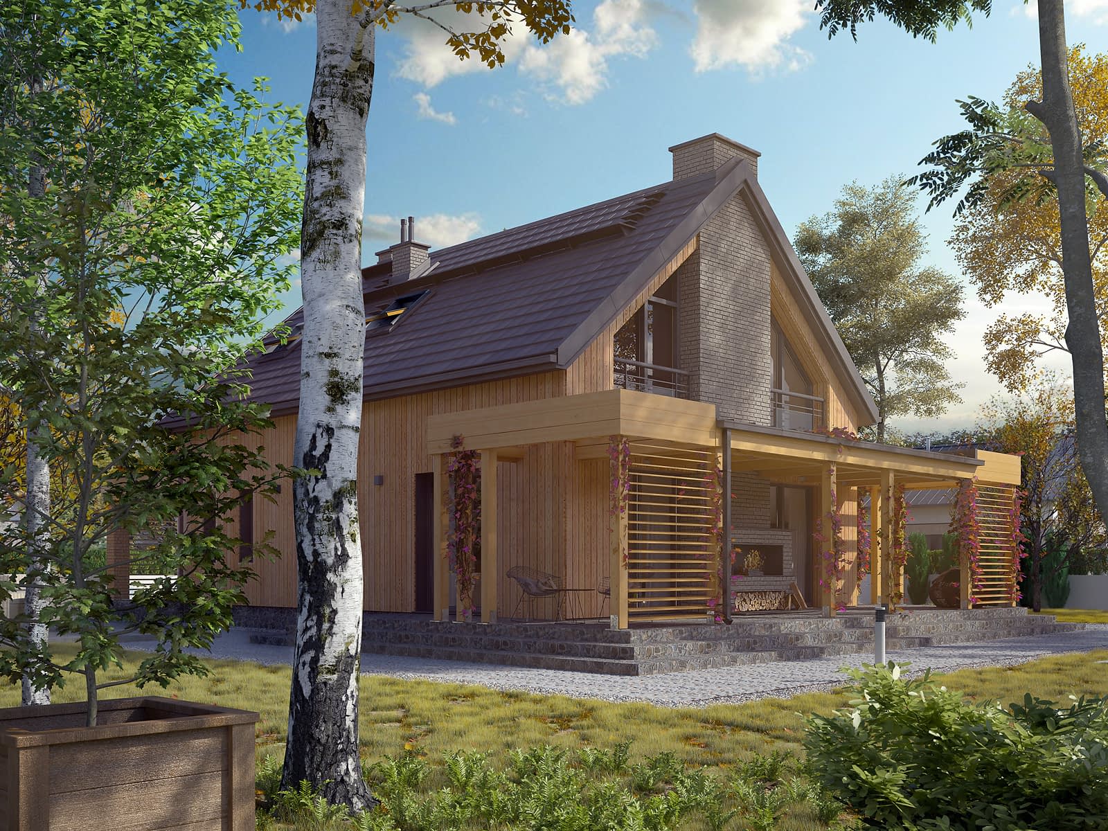 Weranda 3 to nowoczesny projekt domu jednorodzinnego z użytkowym poddaszem. Zaprojektowany został w tradycyjnej, murowanej technologii. Atutem projektu jest taras z zewnętrznym kominkiem. Taras został zadaszony piękna drewnianą pergolą, która nie tylko chroni przed słońcem, ale również jest jego ozdobą. Przepiękny duży salon połączony z jadalnią i otwartą kuchnią, sprawia wrażenie przestronności wnętrza. Na poddaszu znajdują się trzy komfortowe sypialnie oraz jedna duża łazienka. Podobnie jak w poprzednich wersjach projektu, nad salonem znajduje się antresola.Konstrukcja