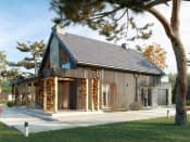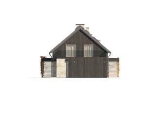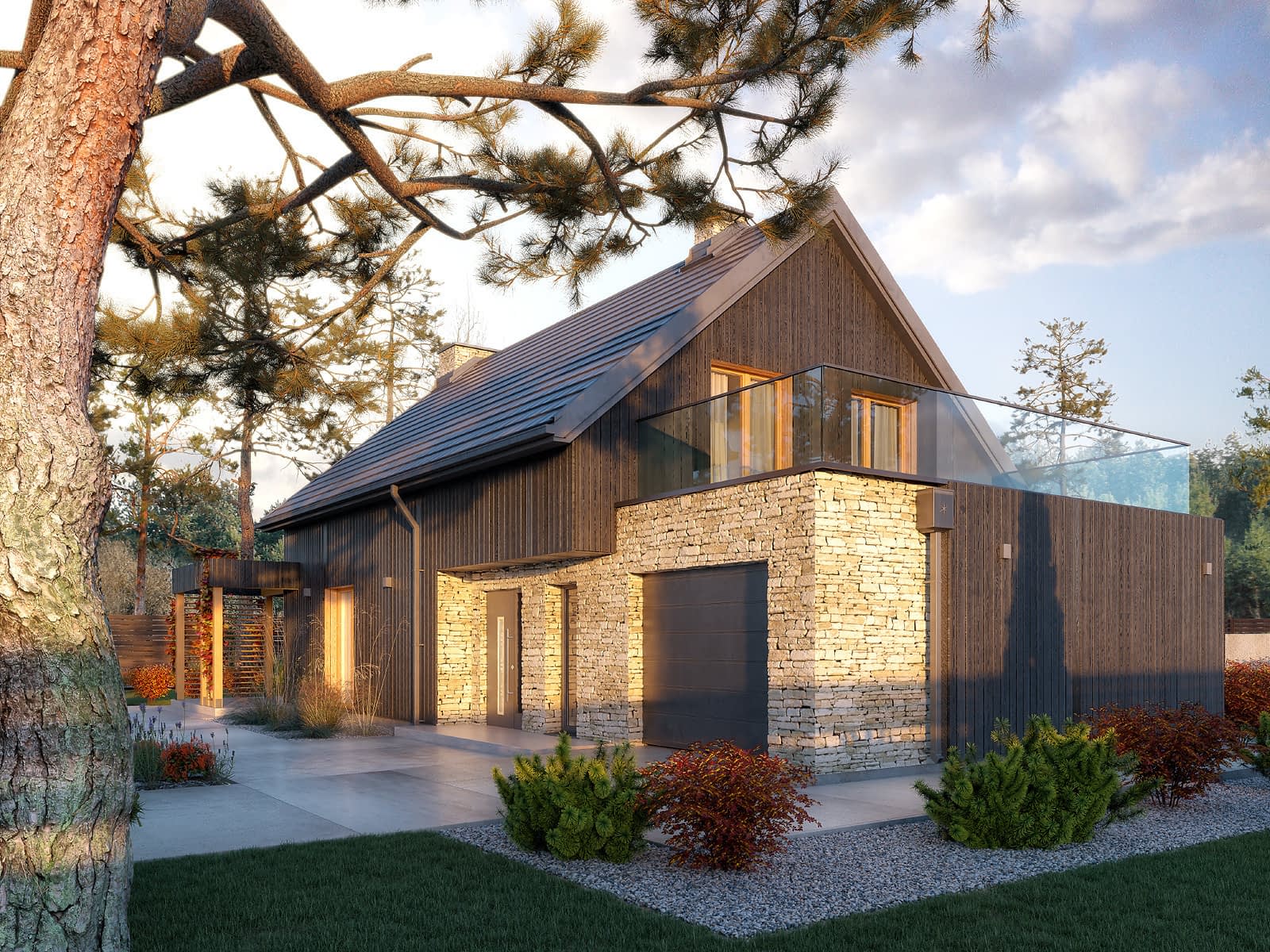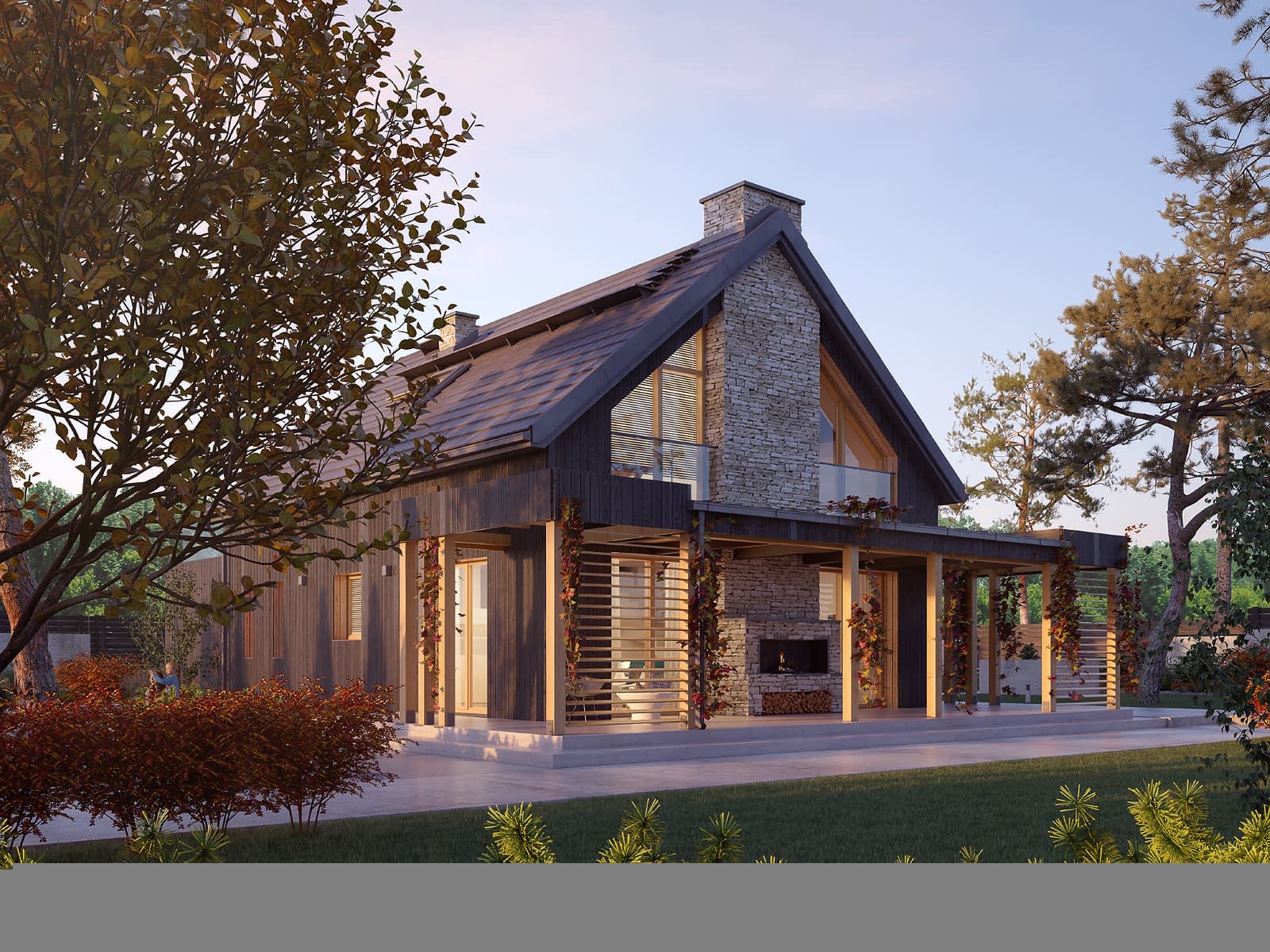 Projekt domu Weranda 6 to nowoczesny projekt domu z użytkowym poddaszem. Prosta bryła została zaprojektowana na planie prostokąta oraz przykryta dwuspadowym dachem. Są to elementy charakterystyczne dla stylu nowoczesnej stodoły. Projekt wyróżnia się także elewacją w nowoczesnym stylu, która w większości została wykończona ciemnym drewnem skontrastowanym jasną stolarką oraz kamieniem elewacyjnym w okolicy wejścia głównego. Układ funkcjonalny został podzielony na część dzienną na parterze oraz nocną na poddaszu. Wielofunkcyjna część dzienna składa się z salonu z kominkiem, jadalni oraz otwartej kuchni z barkiem śniadaniowym. Nad częścią salonu znajduje się antresola. Z salonu znajduje się wyjście na duży taras z zewnętrznym kominkiem, zadaszonym drewnianą pergolą. Na poddaszu zaprojektowano część nocna domu, na którą składają się trzy sypialnie oraz ogólnodostępna łazienka. Dwie z sypialni posiadają dostęp na taras zaprojektowany nad garażem. W projekcie znajduje się również część gospodarcza z jednostanowiskowy garażem oraz kotłownią gazową.Konstrukcja