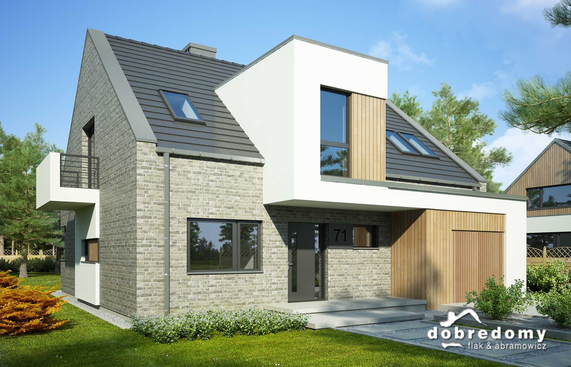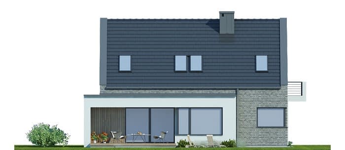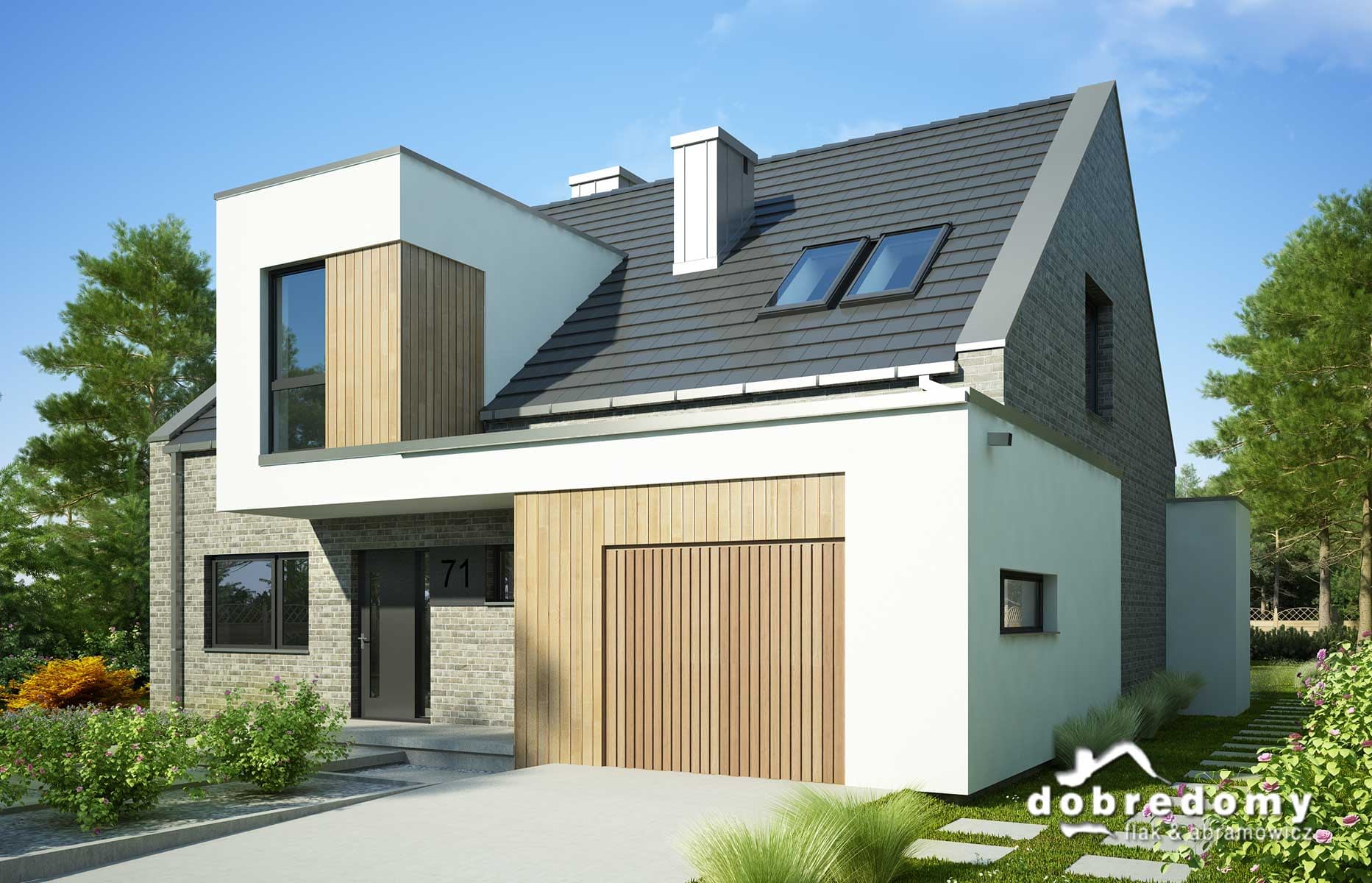 Elewacje pokryte tynkiem w systemie ociepleń Termo Organika, okładziną klinkierową oraz okładziną drewnianą. W projekcie zastosowano okna dachowe marki FAKRO. Pokrycie dachu - dachówka ceramiczna lub cementowa CREATON.
