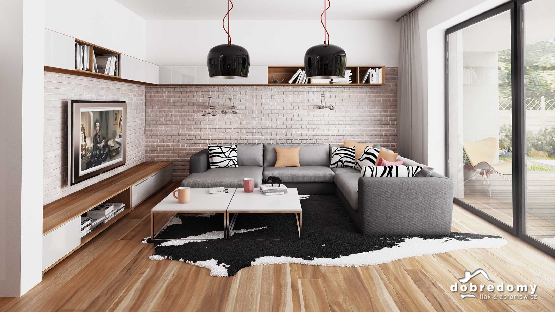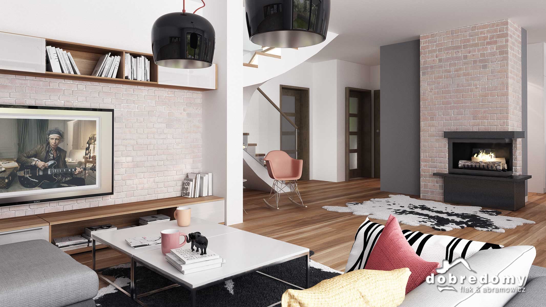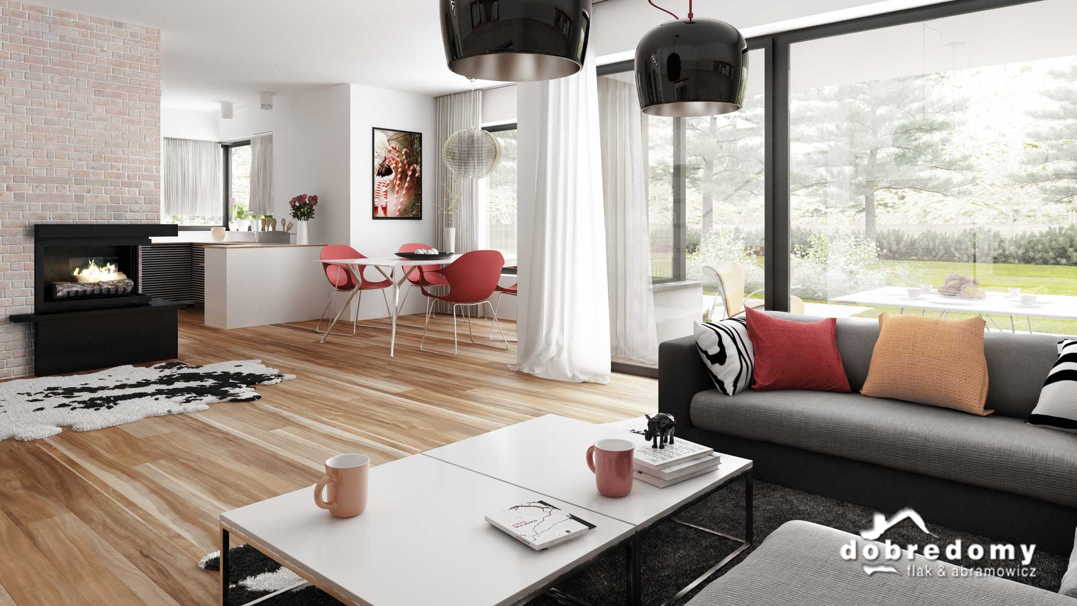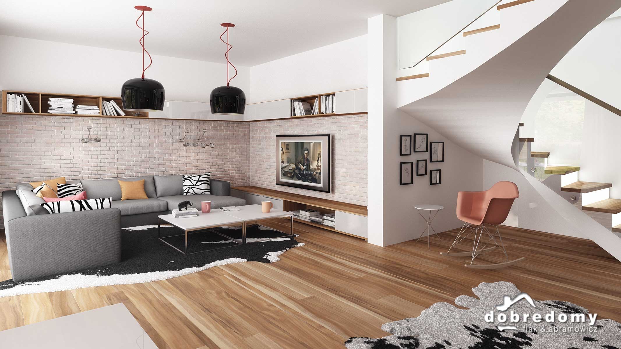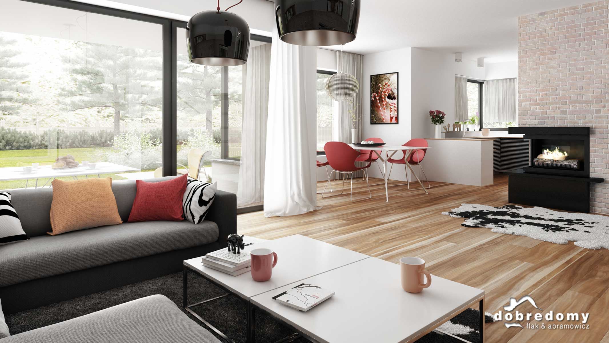 Dom z poddaszem użytkowym, niepodpiwniczony, przeznaczony dla 4-5 osobowej rodziny. Na parterze znajduje się część dzienna i gospodarcza, na poddaszu trzy sypialnie, łazienka i pralnia. Atrakcją domu mogą stać się otwarte na jadalnię i pokój dzienny schody. Centralnie zlokalizowany kominek umożliwia rozprowadzenie ciepła po całym domu.