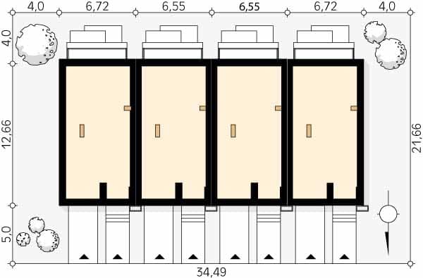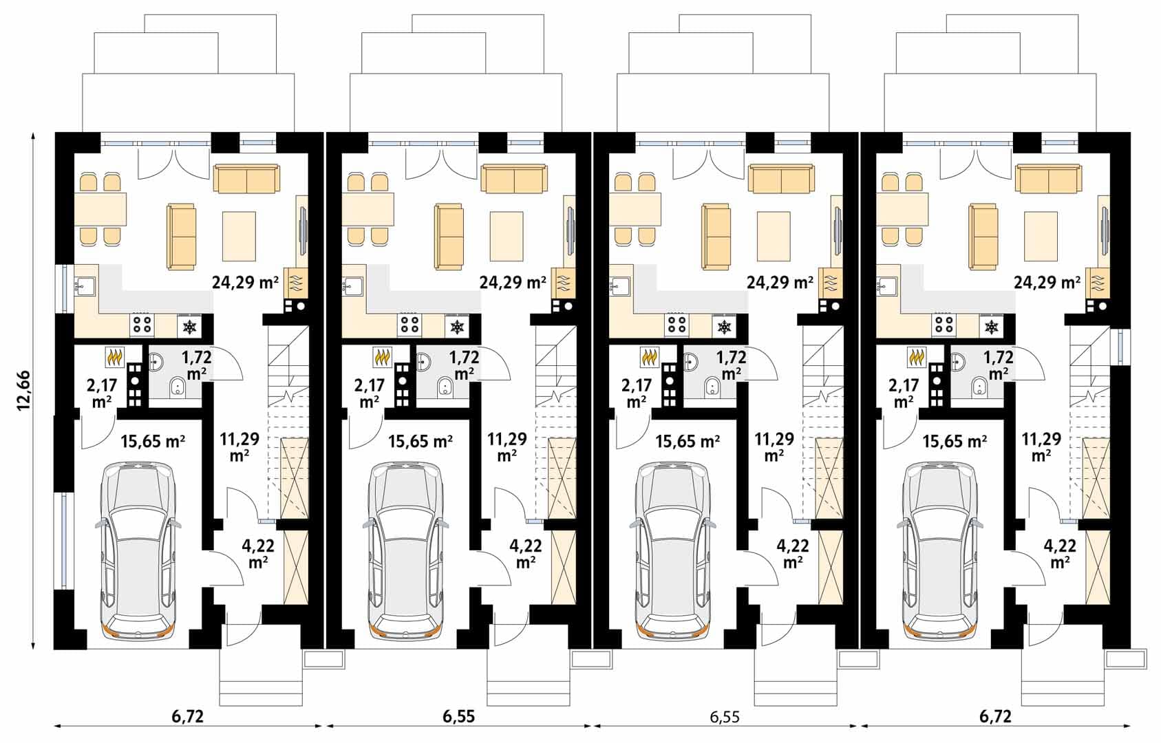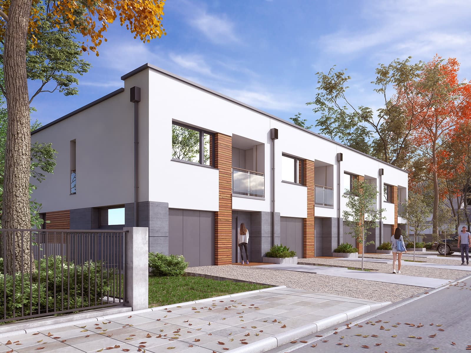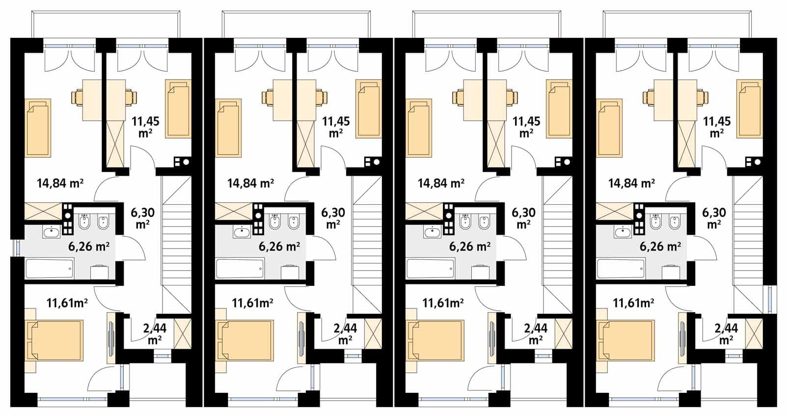 Wiąz to szeregówka o prostej bryle i praktycznych rozwiązaniach funkcjonalnych zaplanowanych na optymalnej powierzchni użytkowej. Strefa dzienna znajduje się na parterze, a nocna na piętrze. Na parterze znajduje się łazienka, wiatrołap z przejściem do garażu i kotłowni oraz strefa dzienna z salonem i otwartą kuchnią. Na piętrze znajdują się trzy wygodne sypialnie, wspólna łazienka i garderoba. Każda z sypialni ma dostęp do balkonu. Istnieje możliwość wykonania projektu budynku z inną liczbą i układem segmentów.Konstrukcja