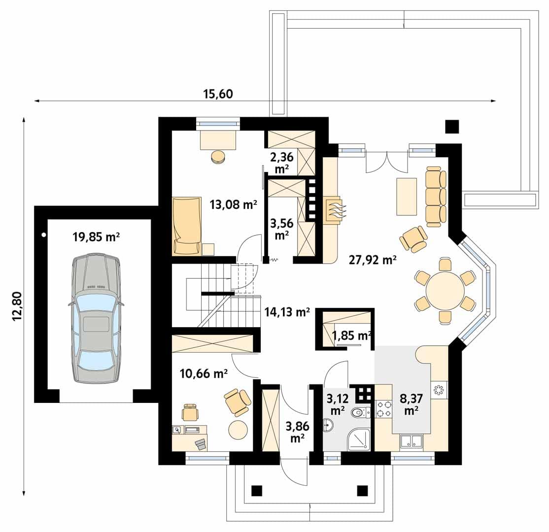 Dom jednorodzinny z użytkowym poddaszem, garażem i piwnicą. Na parterze zaprojektowano część dzienną i dwa dodatkowe pokoje np. na gabinet i sypialnię. Na poddaszu znajdują się trzy pokoje, duża garderoba nad garażem oraz łazienka. W piwnicy zaprojektowano kotłownię, pralnię i pomieszczenie składowe.Konstrukcja