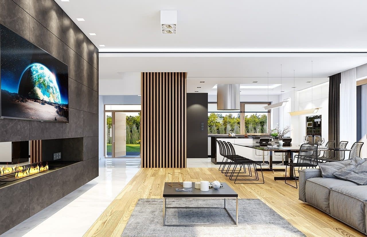 Projekt domu Willa Floryda 3 jest naszą kolejną propozycją projektu z serii nowoczesnych rezydencji Willa Floryda. Dom estetycznie i architektonicznie nawiązuje do serii "Floryd", natomiast układ funkcjonalny i wygląd są zupełnie inne. Budynek jest piętrowy, z dwukondygnacyjnym rdzeniem obudowanym parterowymi częściami od frontu i z tyłu. Dzięki temu bryła jest bardzo urozmaicona i wygląda lekko. Rezydencja Willa Floryda 3 łączy w sobie zalety budynku piętrowego i parterowego, będącego blisko ogrodu i w ludzkiej skali. Elewacje podzielono na poziome pasy: ciemne pasy w grubości kondygnacji i okien, oraz kontrastujące białe pasy w grubości stropów. Jasne części elewacji wystają do przodu, natomiast ciemniejsze fragmenty ścian chowają się, dzięki czemu bryła jest ciekawsza i bardziej rozrzeźbiona. Wejście do domu Willa Floryda 3 zaakcentowane jest pięknym podcieniem, oraz masywną ścianą wykończoną kamieniem, lub betonem architektonicznym. Narożne okno kuchni i przeszklenia piętra dodają frontowi domu lekkości i transparentności. W prawdziwy sposób dom otwiera swoje wnętrze od strony ogrodu. Narożne przeszklenia salonu i sypialni u góry łączą wnętrze z ogrodem. Jednocześnie podcień i pergola oparta na wystającym słupie i podciągu tworzą wewnętrzną przestrzeń tarasową - swoiste patio chroniące prywatność mieszkańców. Nowoczesna sylwetka domu z pewnością wyróżni tą piękną rezydencję z otaczającej nudnej zabudowy. Parter domu Willa Floryda 3 zaprojektowano na planie zbliżonym do kwadratu. Do budynku wchodzimy przez obszerny przedsionek z szatnią, połączony z garażem z jednej strony i spiżarnią i kuchnią z drugiej. W ten sposób zarówno wejście do domu piechotą, jak i przyjazd autem jest wygodny i prowadzi nas w to samo miejsce. Z przedsionka przedostajemy się do holu, z reprezentacyjnymi schodami po prawej i otwartą dużą przestrzenią dzienną po lewej stronie. Pokój dzienny, jadalnia i kuchnia z wyspą łączą się we wspólną niemal 90ciometrową powierzchnię. Salon otwiera się na narożny taras w kształcie litery "L". Na parterze mamy jeszcze dodatkową przestrzeń - dwa pokoje o dowolnym przeznaczeniu - rzadkość w piętrowych domach. Mogą to być sypialnie, lub pokoje do pracy czy rekreacji. Albo może to być wydzielone dodatkowe mieszkanko dla seniorów, lub gosposi. Przestrzeń do dowolnej aranżacji. Z domu Willa Floryda 3 i z garażu dostajemy się też do dużego pomieszczenia gospodarczego - kotłowni. Piętro domu to trzy sypialnie: apartament rodziców z własnymi garderobami i łazienką, oraz sypialnie dzieci z szafami wbudowanymi i łazienką dostępną z holu. Na piętrze mamy też pralnię. Hol piętra połączony jest z parterem otworem schodów, oraz niewielką dziurą w stropie. Projekt domu Willa Floryda 3 jest nowoczesny, luksusowy i komfortowy. Oczywiście projekt Willa Floryda 3 jest budynkiem energooszczędnym - dzięki zastosowanym materiałom i instalacjom. Zapraszamy do zapoznania się z pełną ofertą pracowni MG Projekt: Willa Floryda 2, Willa Floryda, Willa Floryda 4, Rezydencja Floryda, Rezydencja Floryda 2.